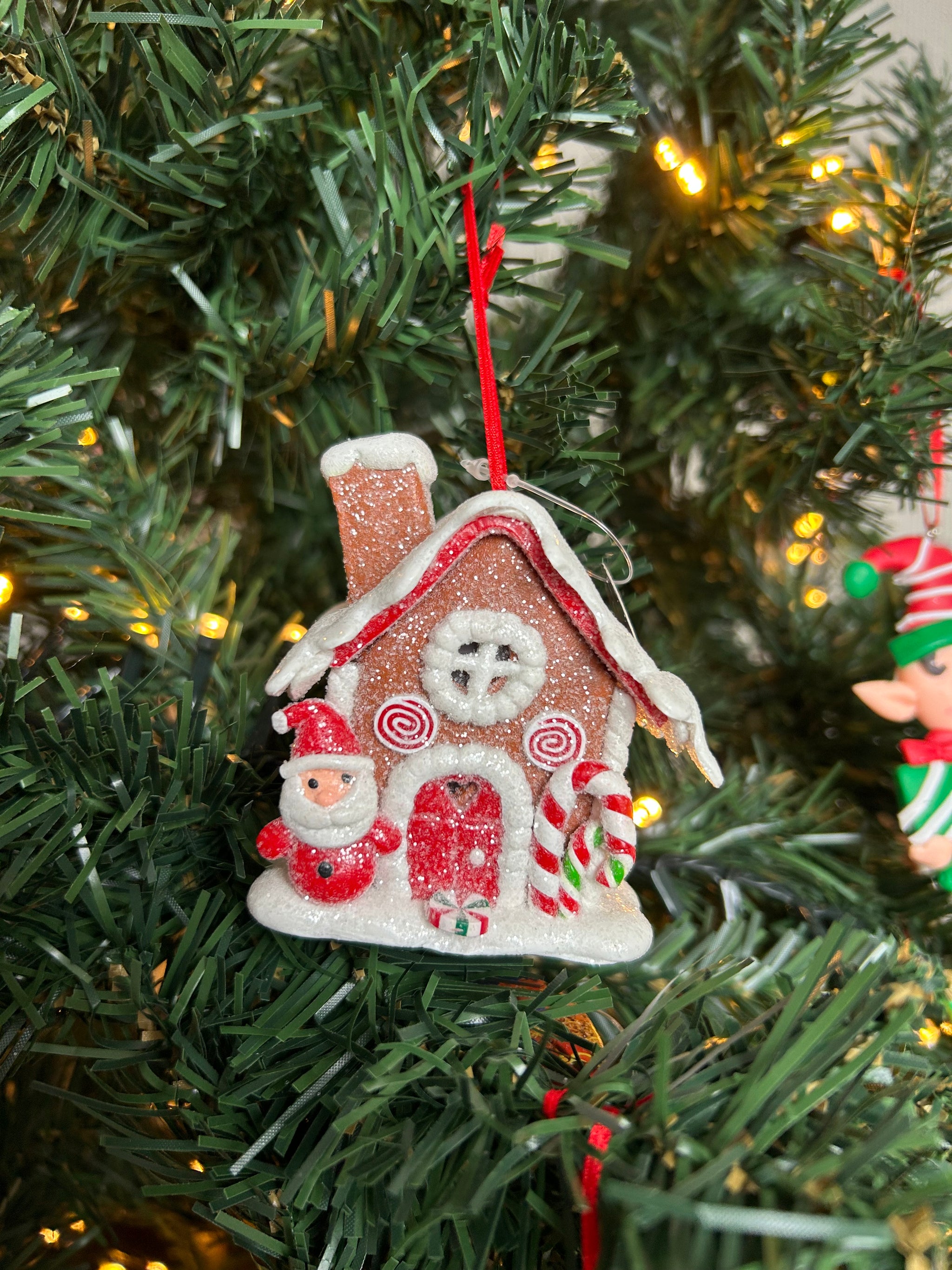 Dit schattige Gingerbread huisje is een mooie toevoeging aan iedere kerstboom. Dit huisje heeft een besneeuwd dak en is gedecoreerd met pepermuntsnoepjes en een zuurstok. Bij de voordeur staat een Kerstmannetje. Ook is het huisje geheel gedecoreerd met glitters voor een gesuikerde look. Dit huisje is er ook in twee andere varianten met een sneeuwpop en een cadeau naast de voordeur en een variant met een sneeuwpop en een kerstboom naast de voordeur.