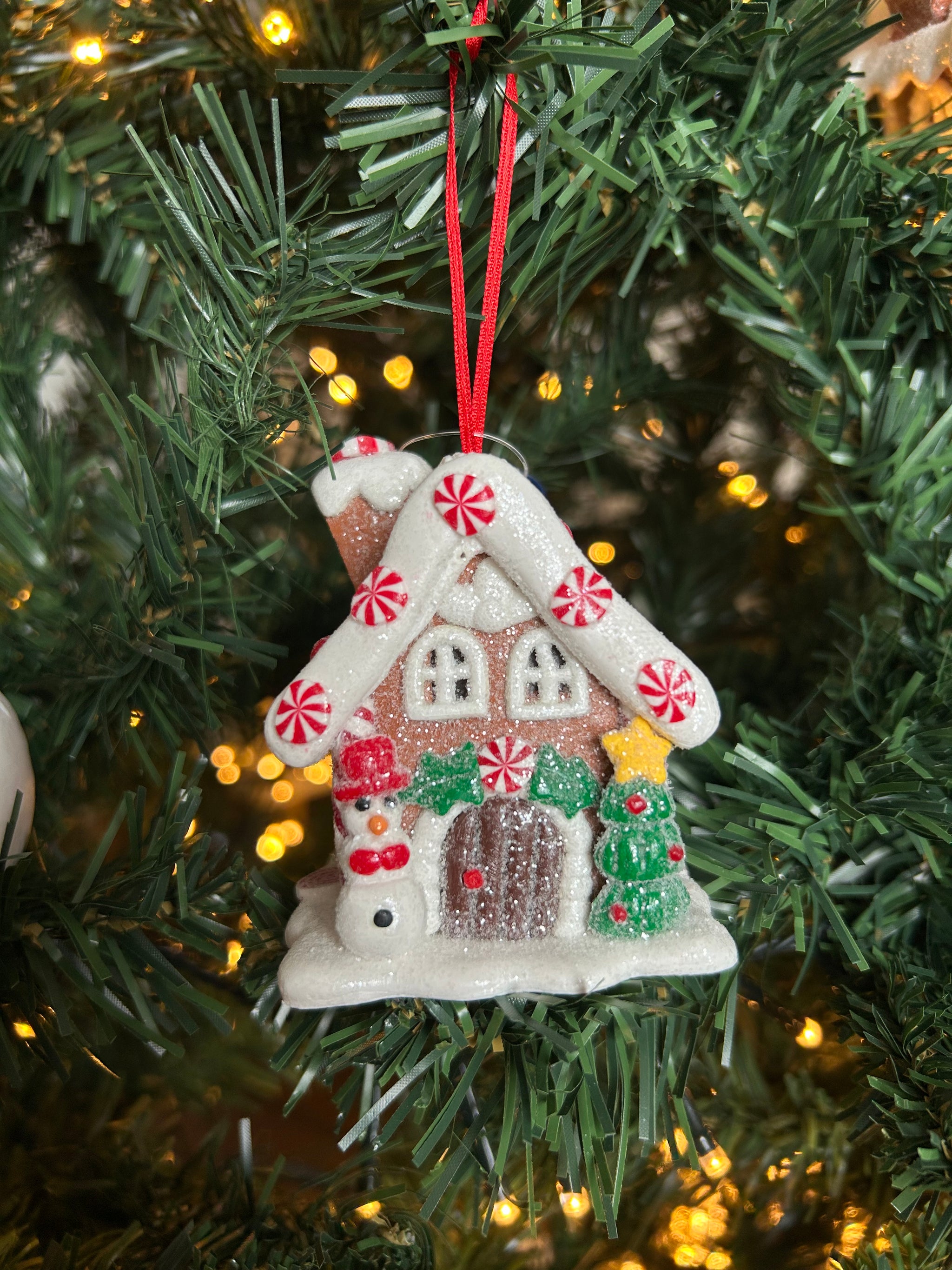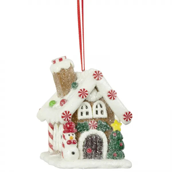 Dit schattige Gingerbread huisje is een mooie toevoeging aan iedere kerstboom. Dit huisje heeft een besneeuwd dak en het dak is ook gedecoreerd met snoepgoed. Bij de voordeur staat een sneeuwpop en een kerstboom. Ook is het huisje geheel gedecoreerd met glitters voor een gesuikerde look. Dit huisje is er ook in twee andere varianten met een Kerstmannetje naast de voordeur en een variant met een sneeuwpop en een kerstboom naast de voordeur.