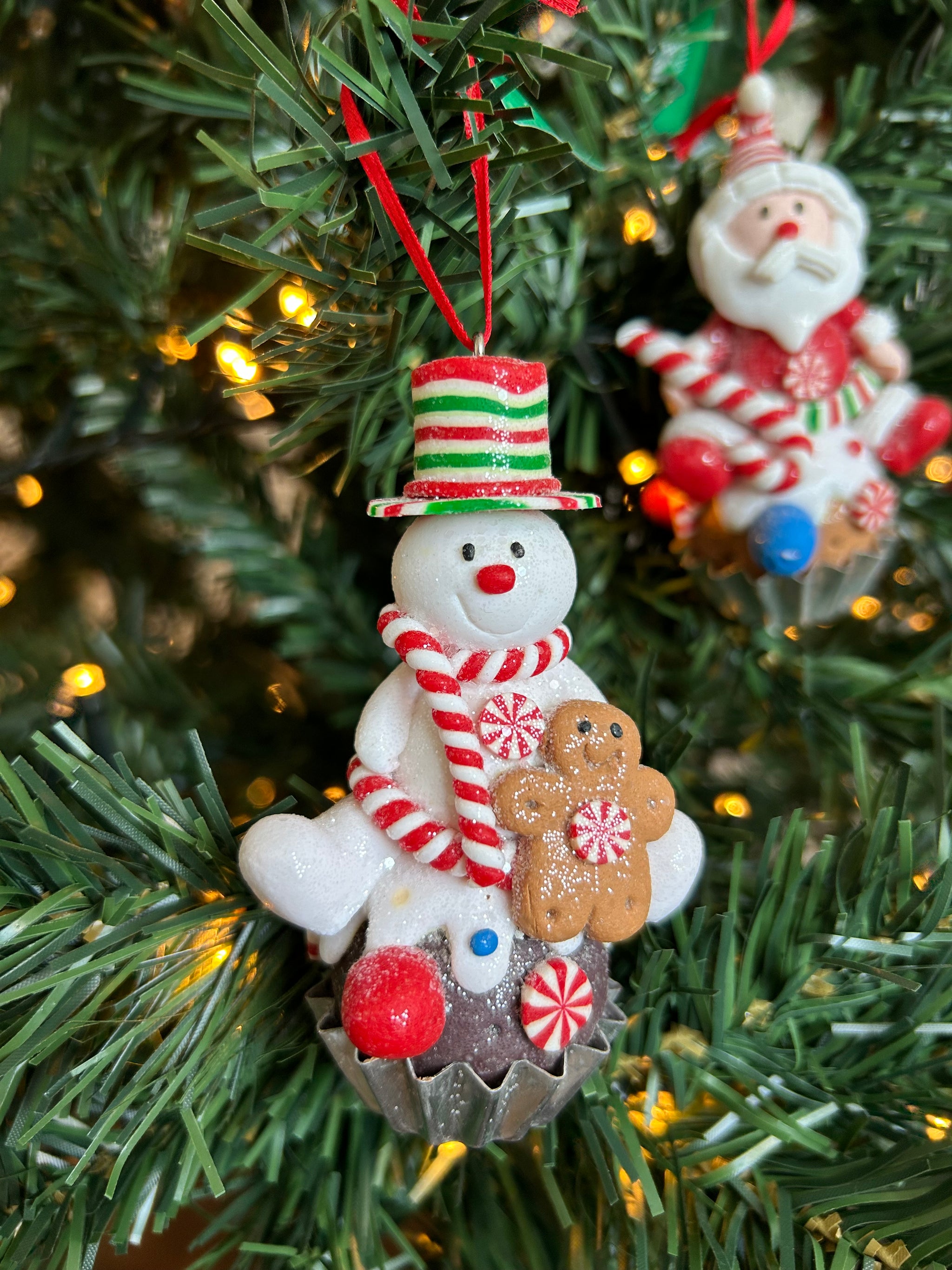 Ditpeperkoek cupcake ornament van Kurt S. Adler is een leuke aanvulling op elk kerstdecor of kerstboom!  Dit assortiment bestaat drie varianten met vakantiefavorieten bovenop de cupcakes. Deze favorieten zijn de Kerstman, een sneeuwpop en een peperkoekmannetje. Elk van de beeldjes houdt snoepstokken vast en is versierd met snoepgoed en glitters voor een gesuikerde look. Dit is de variant met de sneeuwpop bovenop de cupcake.