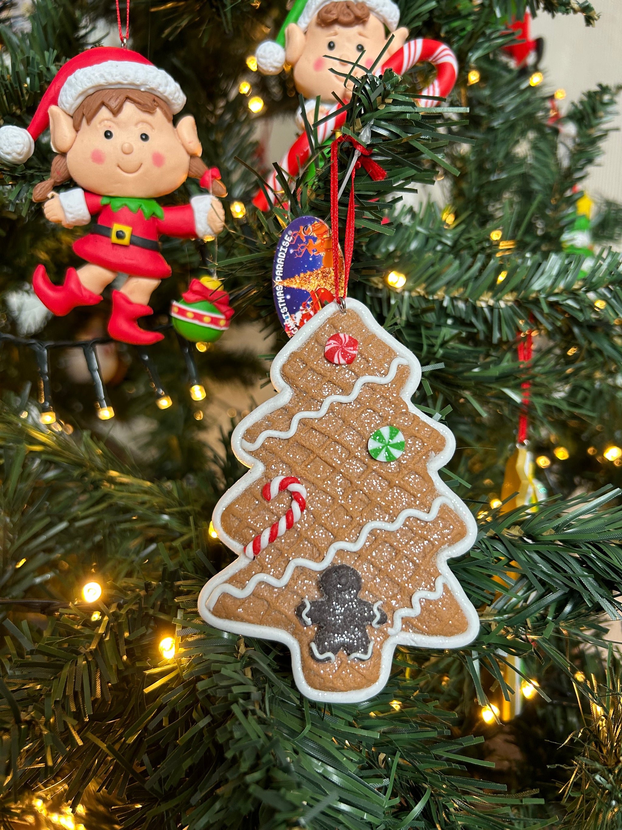 Deze kersthanger in de vorm van een kerstboom lijkt gemaakt van peperkoek (Gingerbread). Deze kerstboom is bruin van kleur en is versierd met een klein Gingerbread poppetje, zuurstok, pepermuntsnoepjes en is mooi afgewerkt met glitters. Deze kersthanger is er ook in een andere versie: een kerstboom gedecoreerd met onder andere een bloemetje.