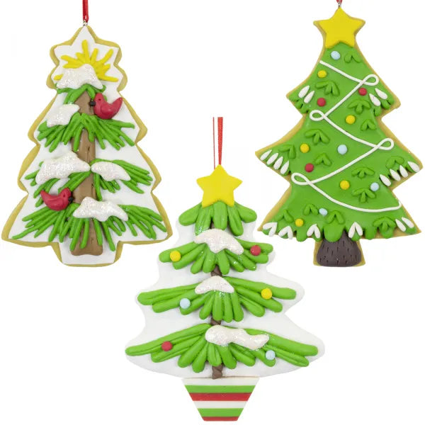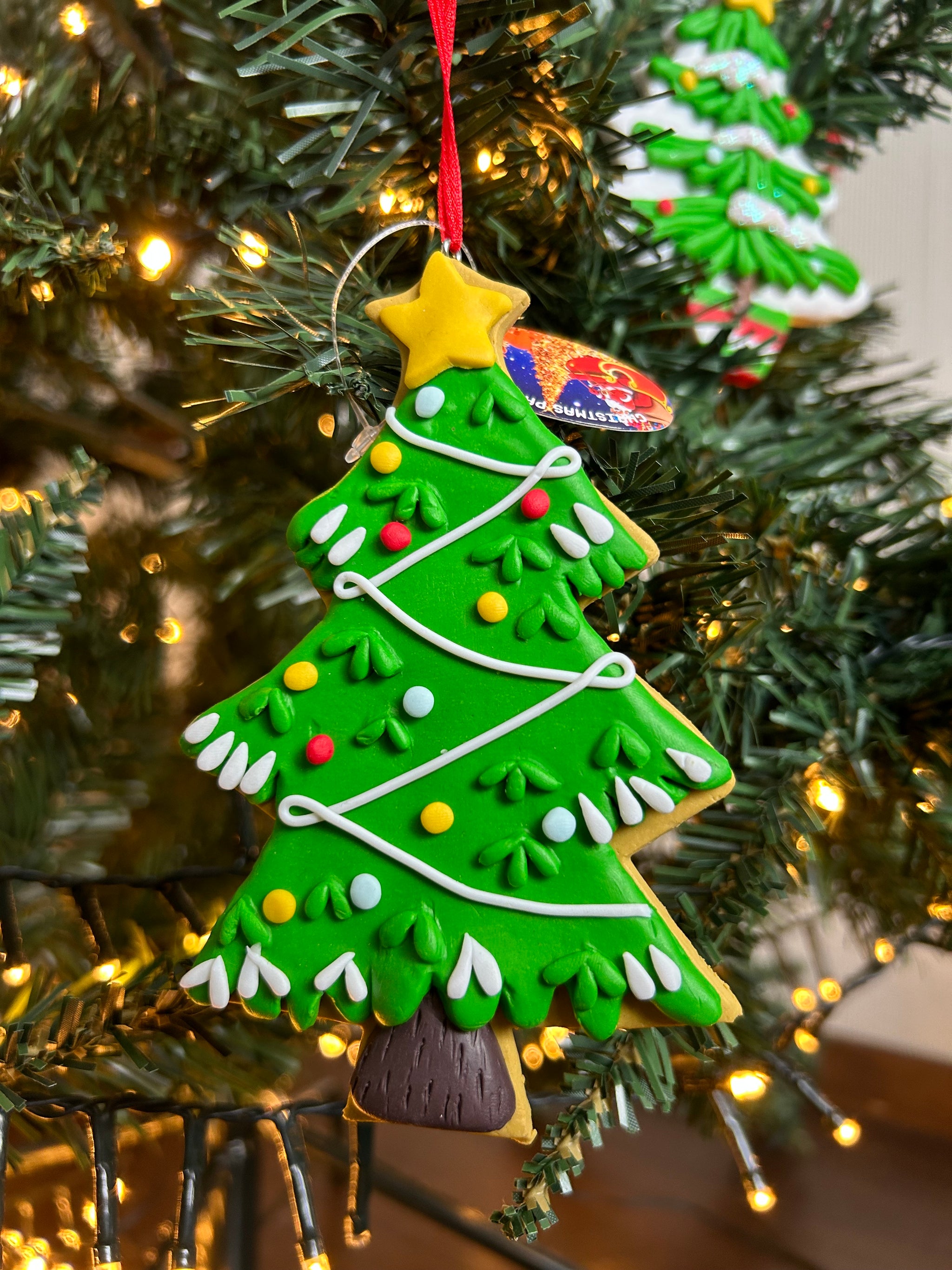 Deze kersthanger in de vorm van een kerstboom is groen van kleur en is voorzien van gekleurde lampjes en slingers. Verder heeft deze kersthanger een gele piek in de vorm van een ster. Deze kersthanger is er ook in twee andere varianten: een kerstboom met twee vogeltjes en een kerstboom met lampjes.