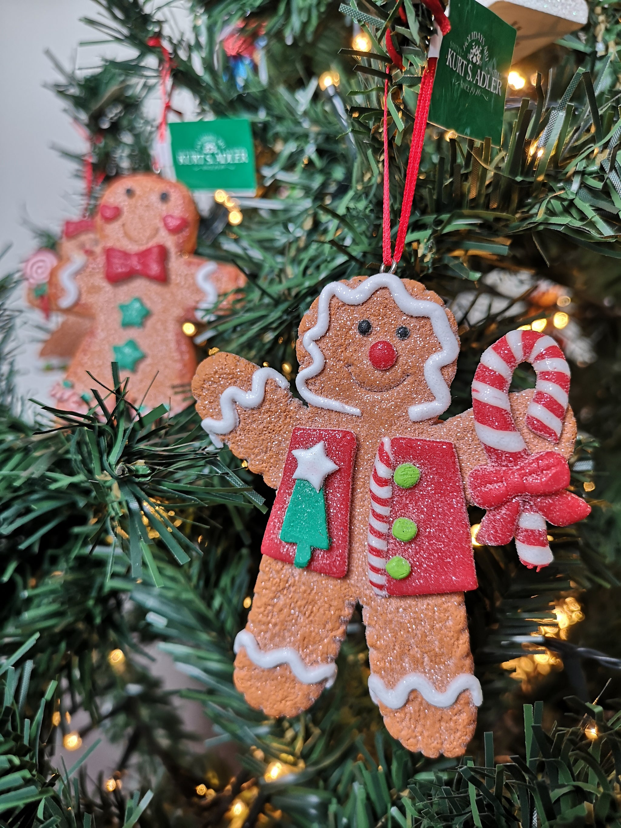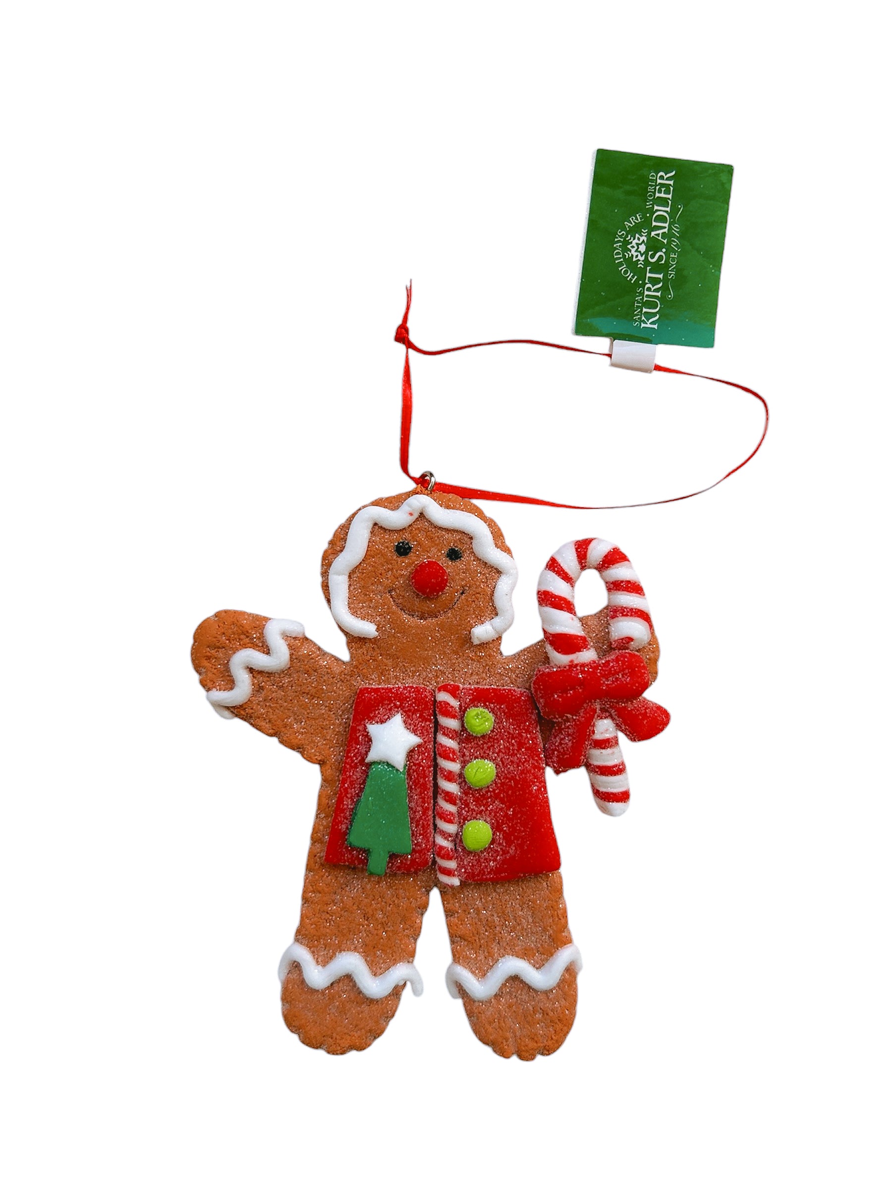 Dit gingerbread poppetje komt uit de collectie van Kurt S. Adler en is uitgevoerd in pepermunt kleuren. Dit gingerbread jongetje heeft witte biezen, een rood jasje en een zuurstok in zijn hand. Ook is hij bestrooid met glitters voor een gesuikerde look. Dit gingerbread poppetje is er in vier verschillende varianten.