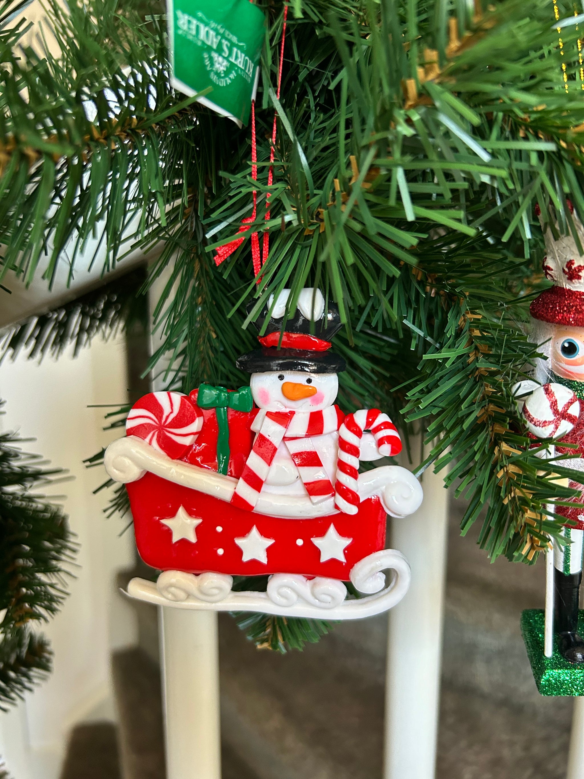 Deze kersthanger van een sneeuwpop in een slee is een leuke toevoeging aan elk kerstdecor. In zijn slee heeft de sneeuwpop peppermint snoepjes en een cadeautje. Op de slee zijn witte sterren zichtbaar. Deze kersthanger is er ook met een Kerstman in zijn slee. Samen passen zij bij verschillende kerststijlen.