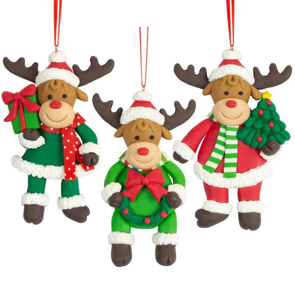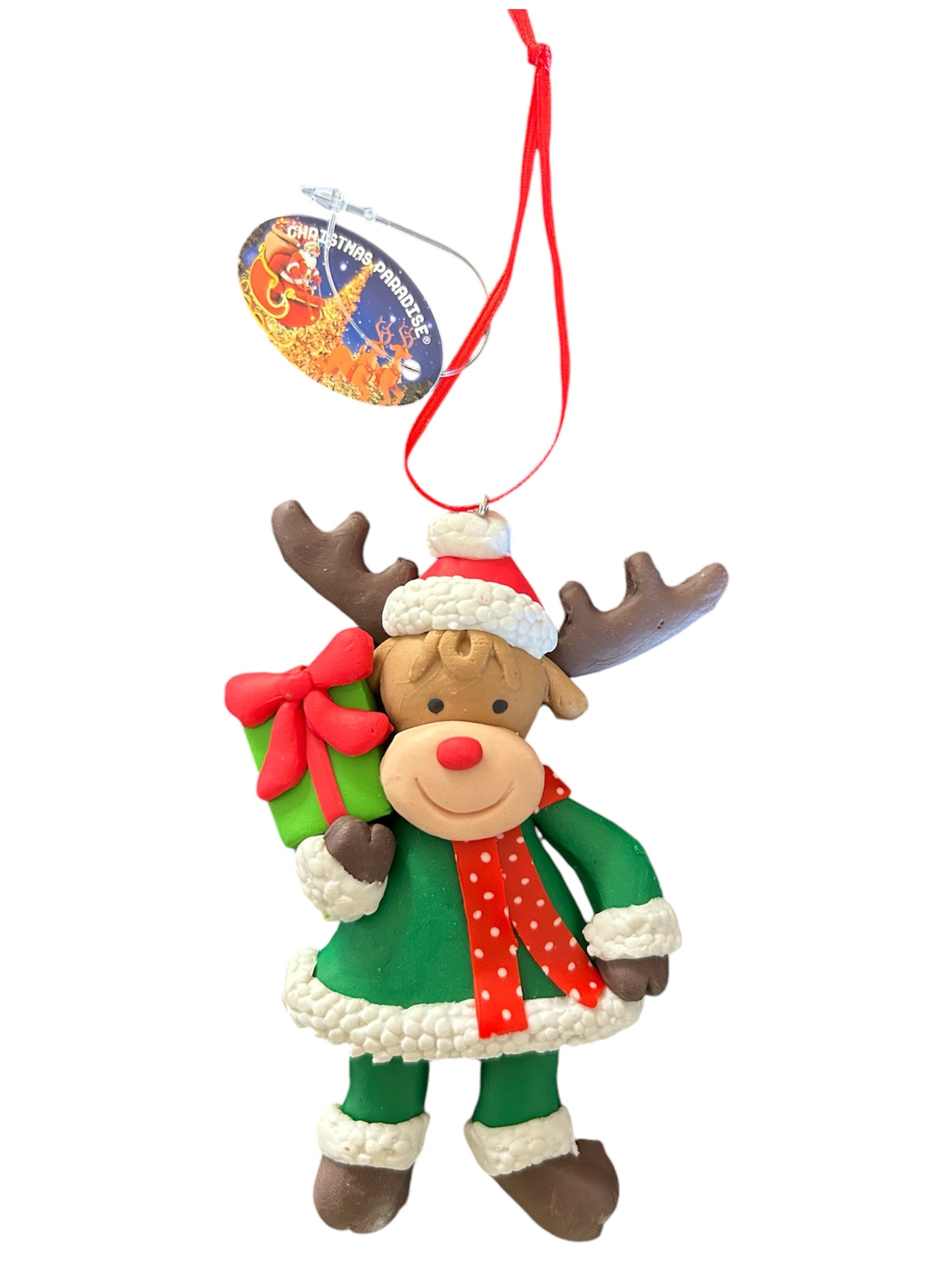 Verrijk je kerstdecoratie met deze schattige en feestelijke kersthanger: een rendier dat zich heeft uitgedost in een kerstpak, compleet met een kerstmuts, een rood/wit gestipte sjaal en een cadeautje in zijn hand! Het rendier is gekleed in een groen kerstpak met witte bontafwerking en draagt een traditionele rode kerstmuts. In zijn hand houdt hij een klein, kleurrijk ingepakt cadeautje vast, klaar om te geven. Deze kersthanger is er ook in twee andere uitvoeringen: een rendier met een kerstkrans (rendier kerstmuts - kerstkrans) en een rendier met een kerstboompje (rendier kerstmuts - kerstboom). Deze zijn apart te bestellen. Deze speelse rendieren brengen een flinke dosis vrolijkheid en kerstplezier naar je kerstboom, perfect voor iedereen die houdt van een knipoog naar de traditionele kerstsfeer.