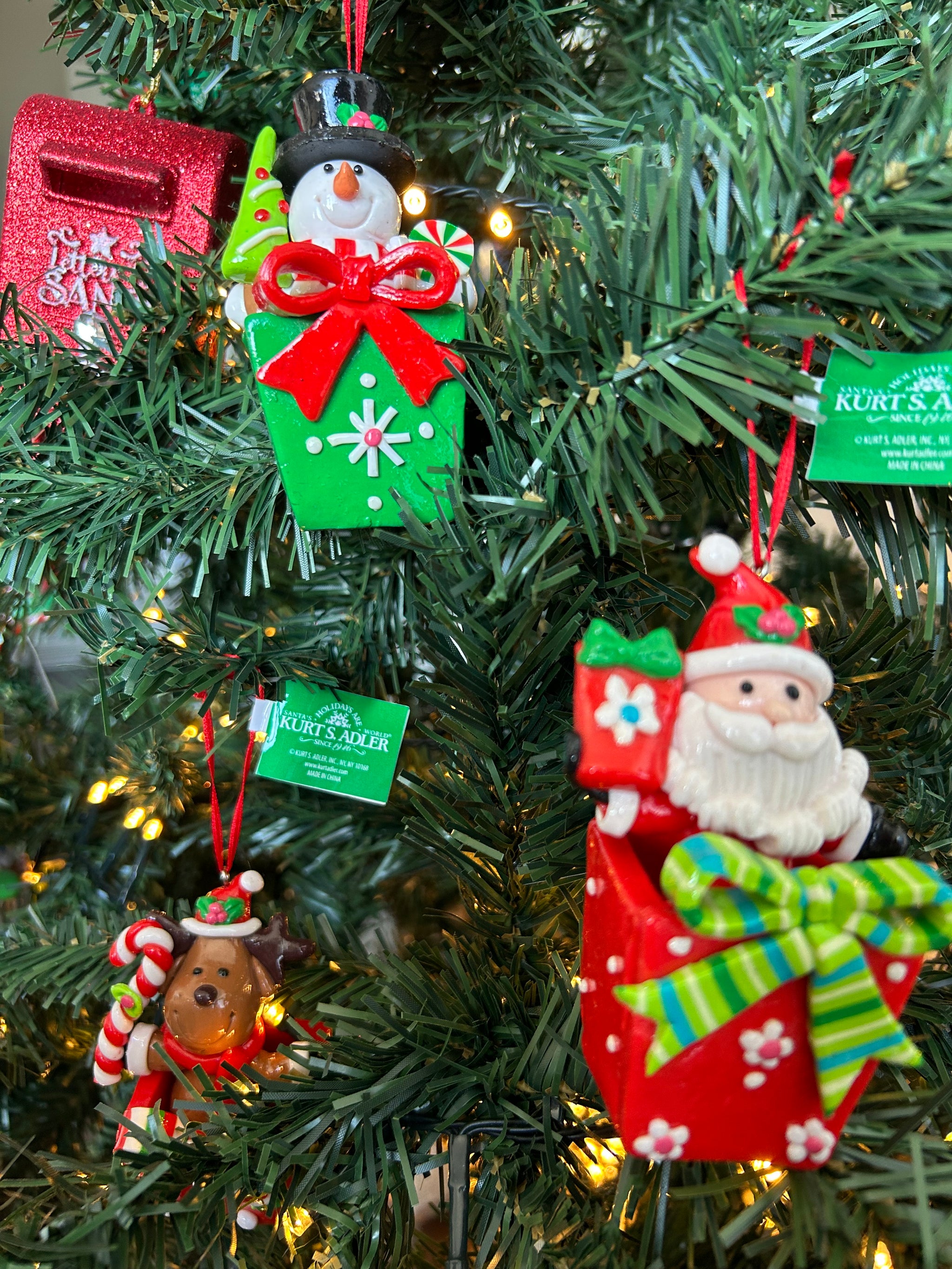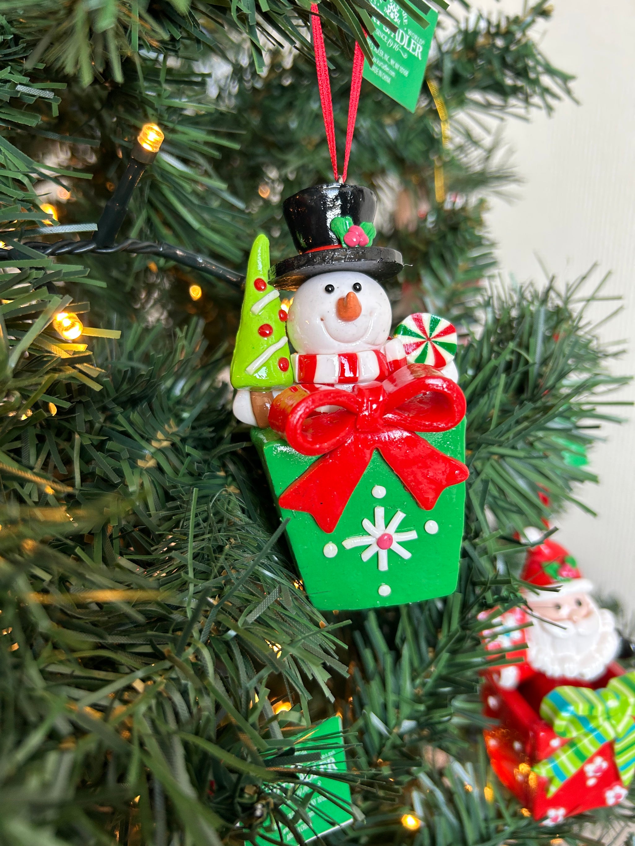 Deze mooie kersthanger in de vorm van een cadeautje met hierop één van de vakantiefavorieten is afkomstig uit de Kurt S. Adler collectie. Het groene cadeautje is versierd met een grote rode strik. Bovenop het cadeautje zit een sneeuwpop met een hoed op en kerstboompje in zijn hand. Deze kersthanger is er in drie verschillende uitvoeringen. De andere uitvoeringen hebben andere vakantiefavorieten op het cadeautje namelijk een rendier en de Kerstman.