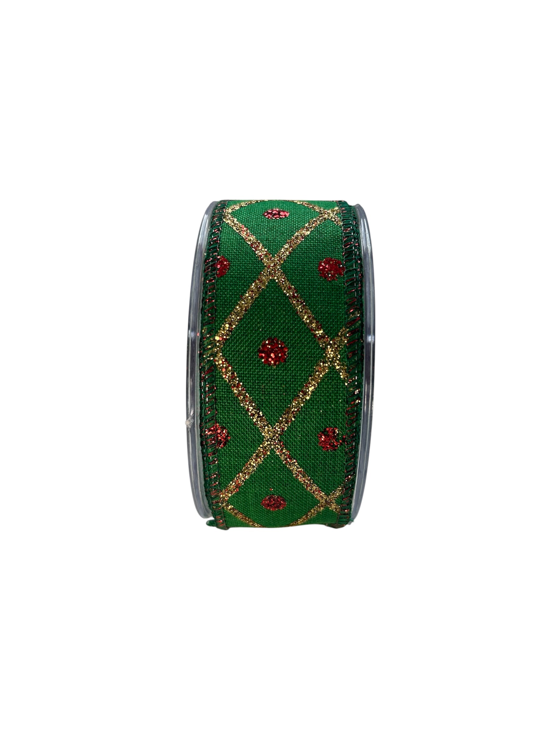 Add a festive and luxurious touch to your Christmas decorations with this green ribbon. It features a checkered pattern of gold glitter and red glitter dots. Perfect for creating beautiful bows or adorning your gifts, wreaths, or table decorations.