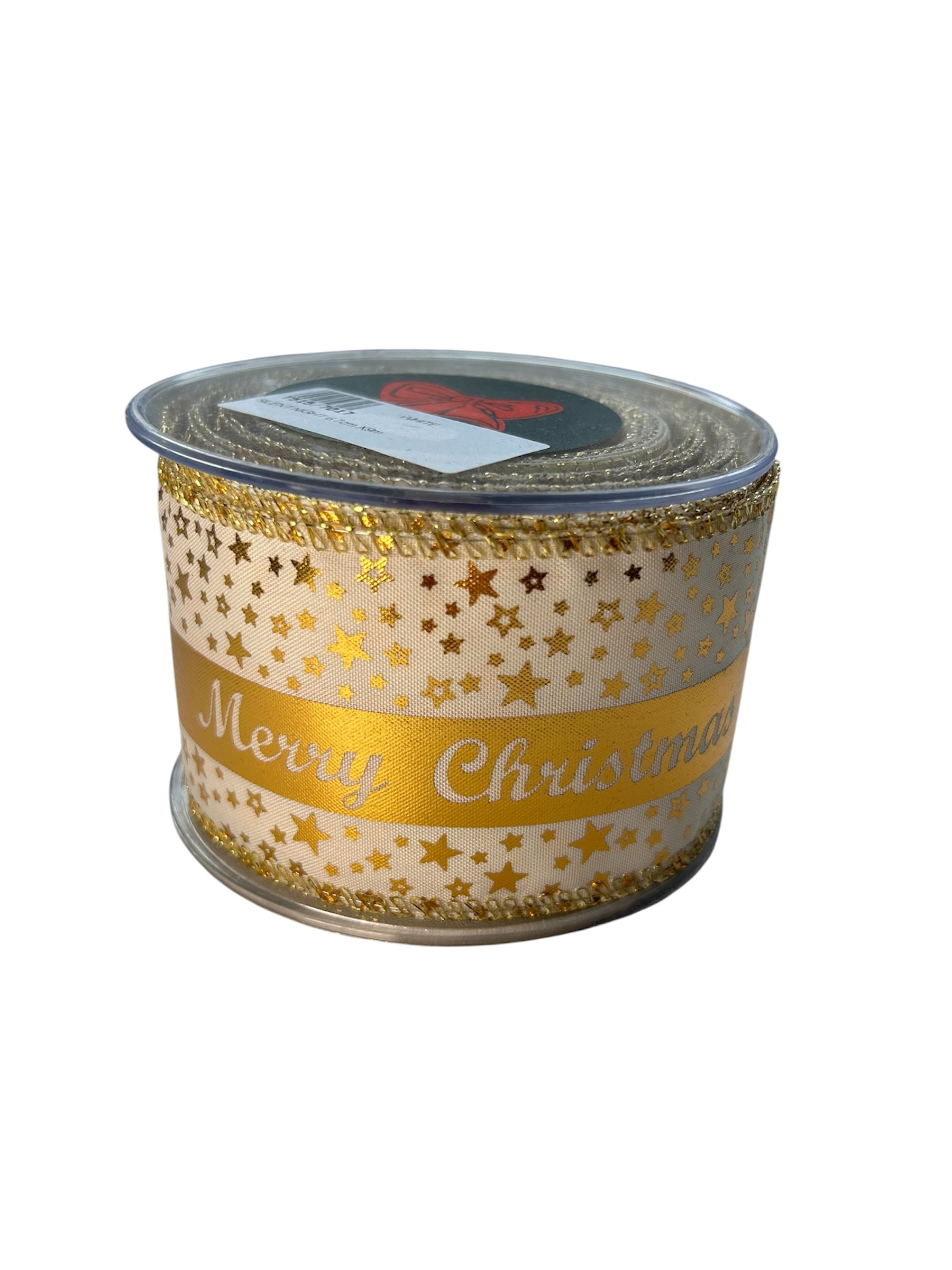 Give your Christmas decorations an elegant and festive touch with this white ribbon, adorned with shimmering gold stars and a central gold stripe that reads "Merry Christmas." Perfect for gifts, wreaths, table decorations, or your Christmas tree.