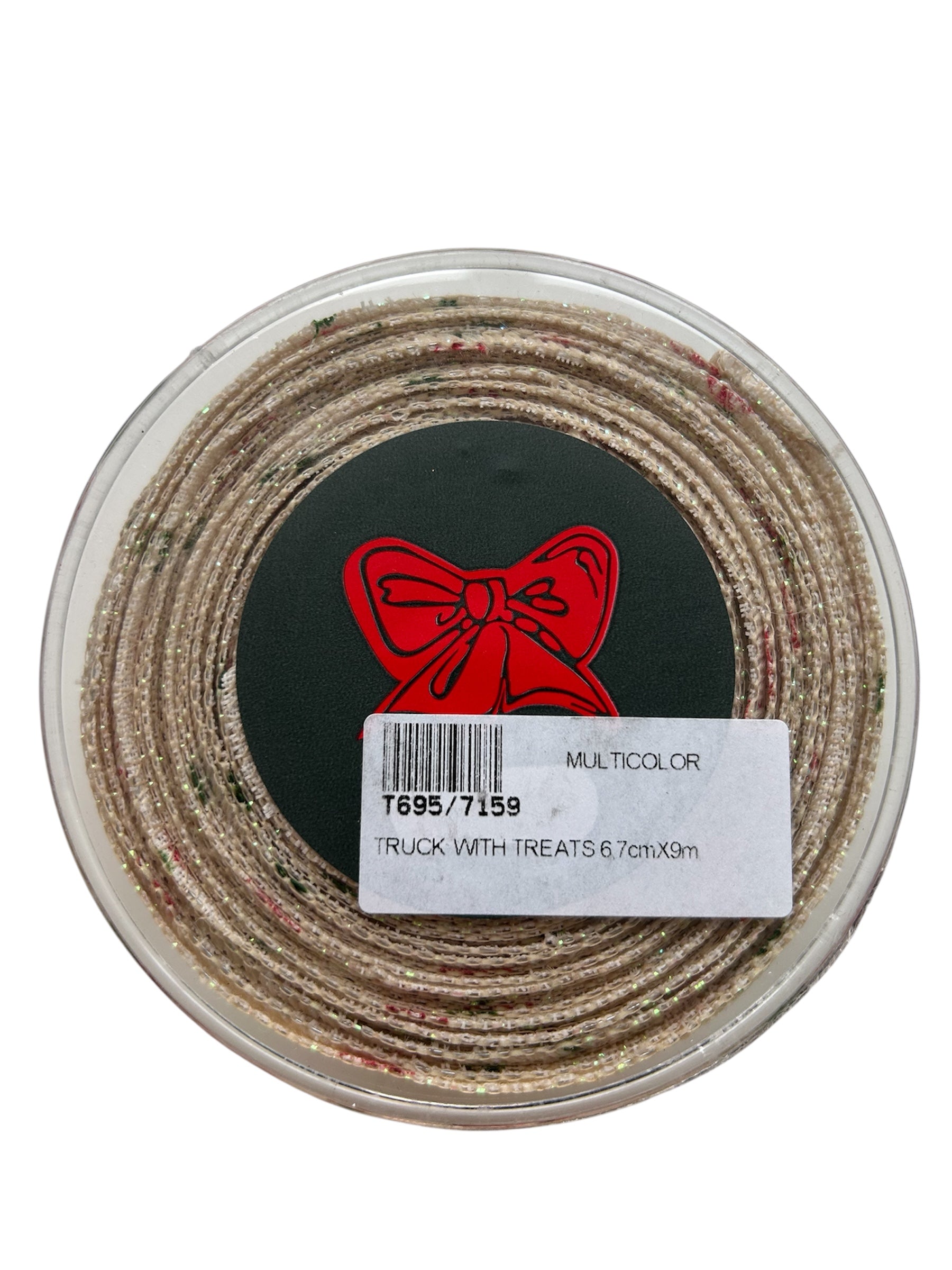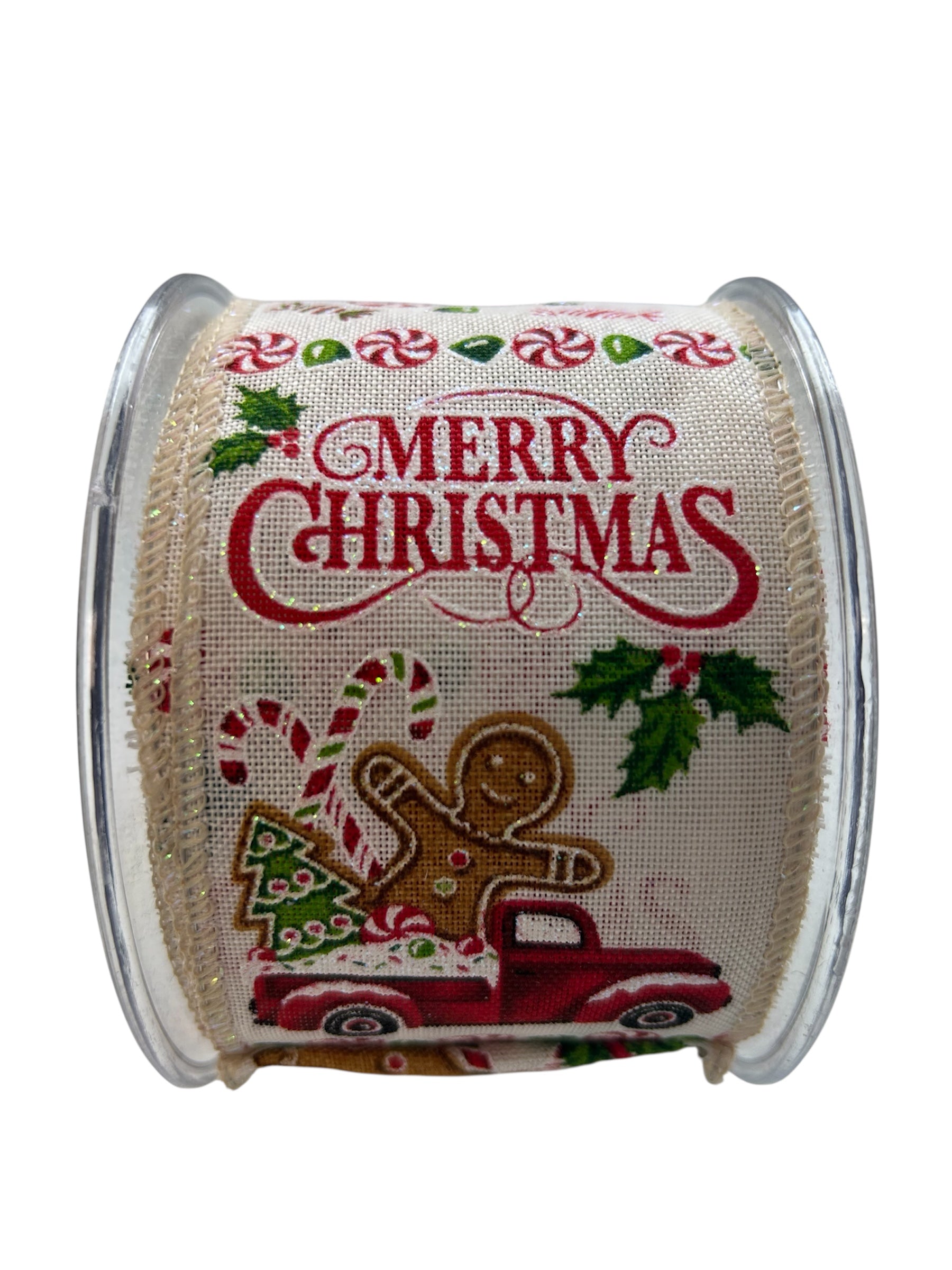 Add a cheerful and festive touch to your Christmas decorations with this beige ribbon, printed with "Merry Christmas," candy decorations, and a red car full of festive details: a gingerbread man, a Christmas tree, and a candy cane. Perfect for gifts, wreaths, table decorations, or your Christmas tree, and ideal for those who love a playful and cozy Christmas atmosphere.